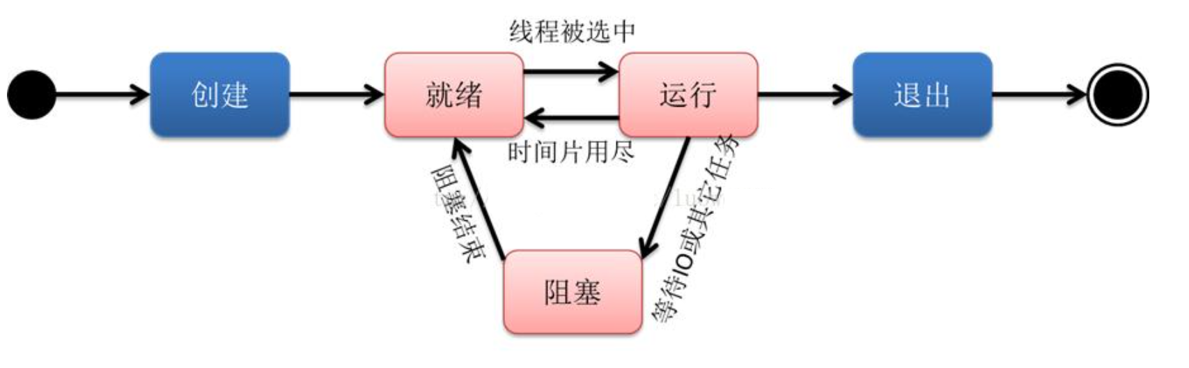 # 退出:一个线程完成任务或者其他终止条件发生,该线程终止进入退出状态,退出状态释放该线程所分配的资源。