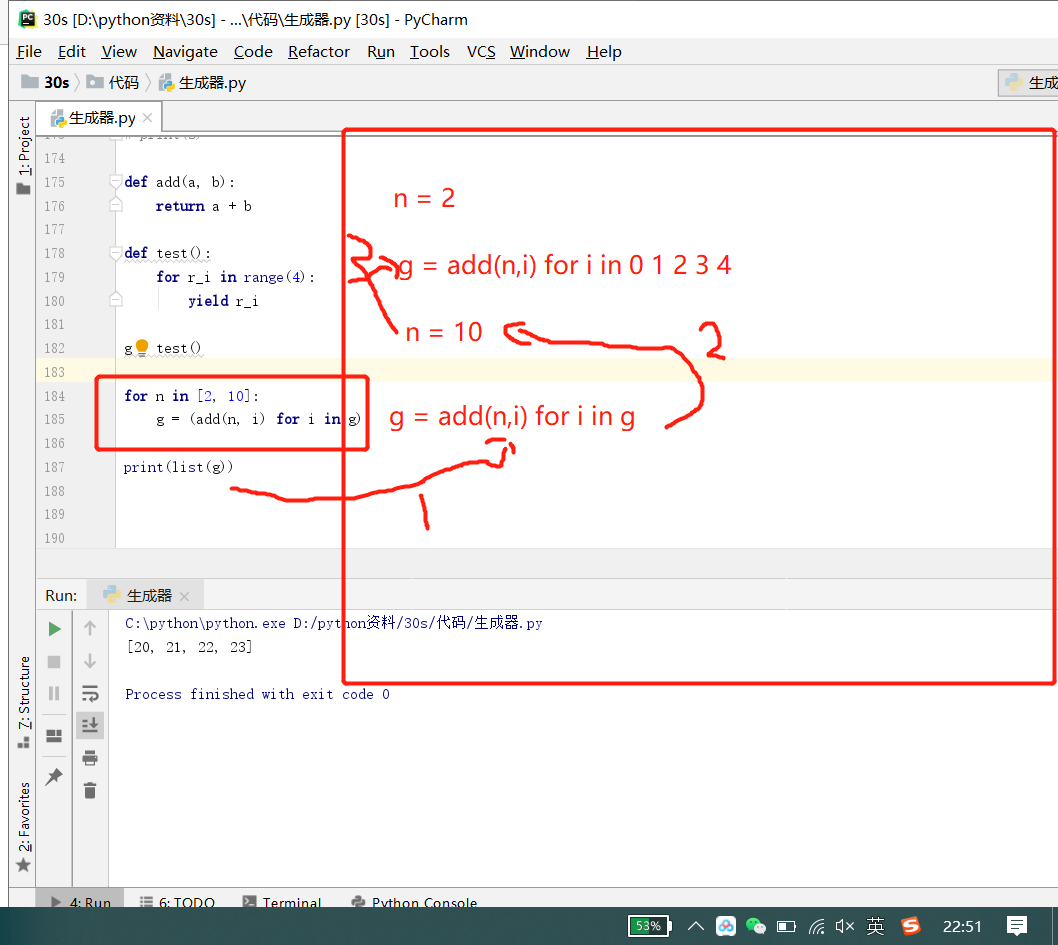 File "D:/python资料/30s/代码/生成器.py", line 35, in <module>