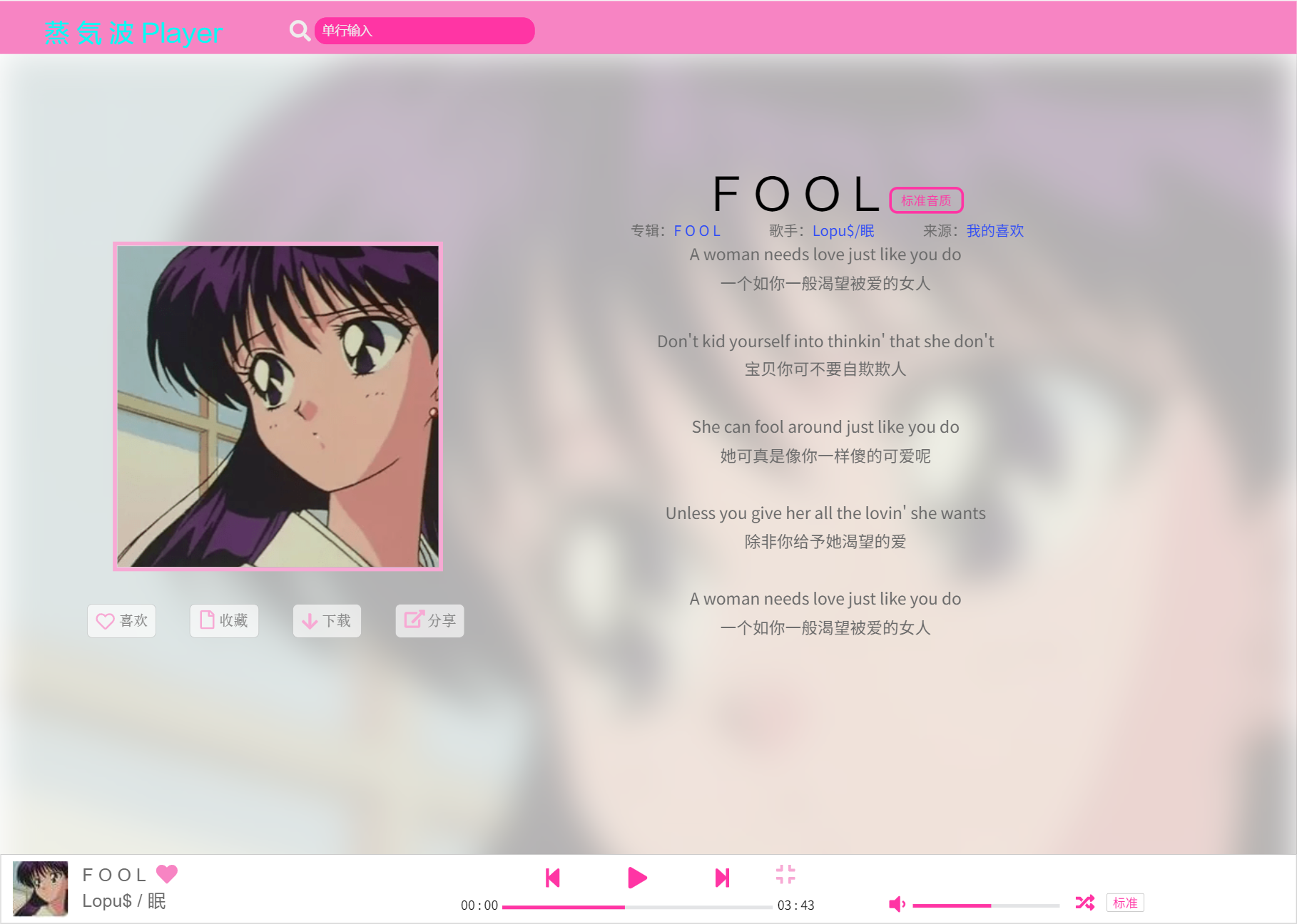 播放界面有基础音乐功能的同时,可以查看歌词,勾选音乐为我的喜欢,下载,收藏,分享等功能。