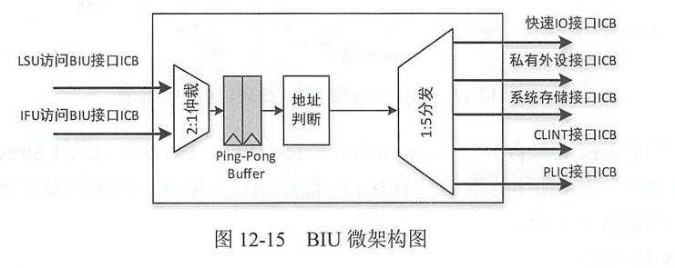 BIU有两组输入ICB接口,分别来自IFU和LSU,通过一个ICB汇合模块合成一组ICB总线,采用优先级仲裁,LSU具有更高的优先级