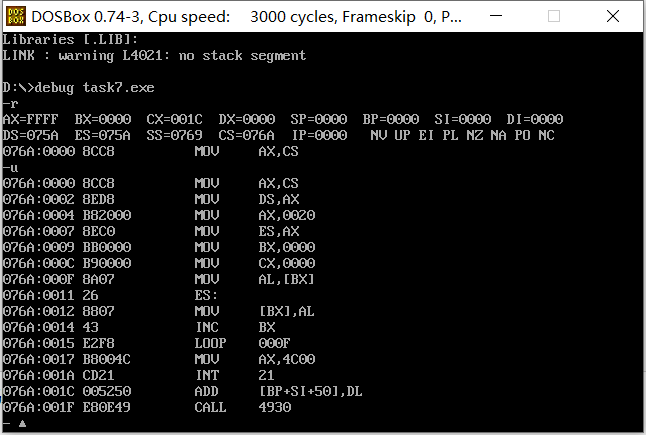 (3)可以通过masm、link来对程序编译链接,从而运行;运用debug观察程序内存状态。