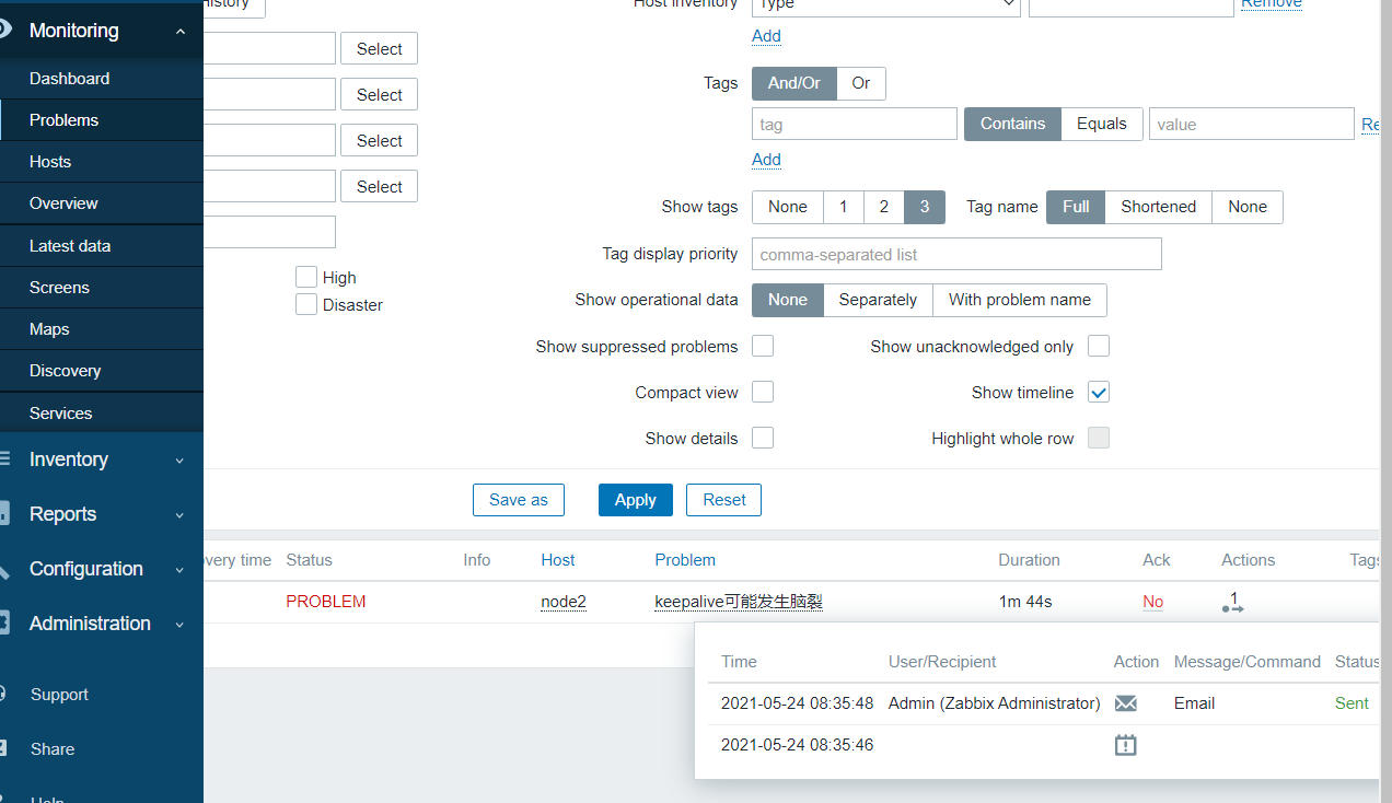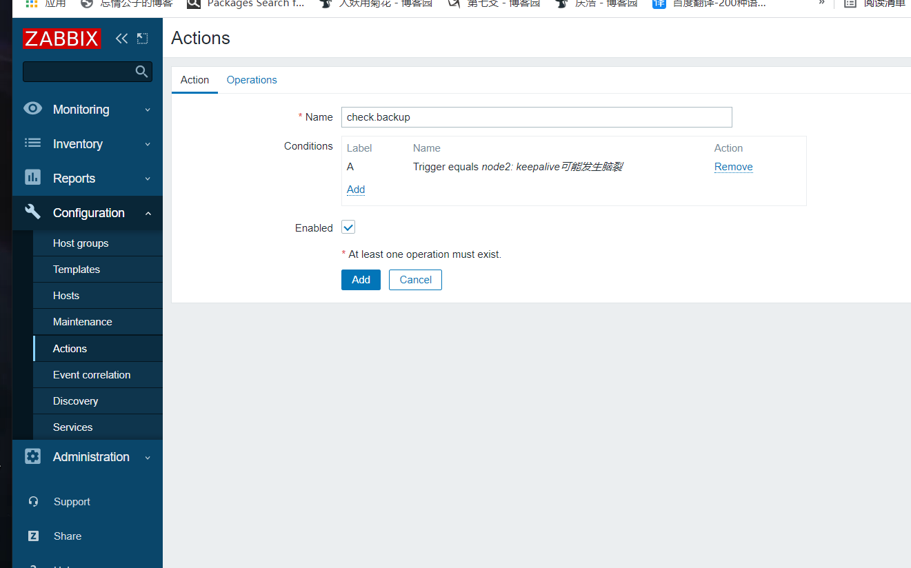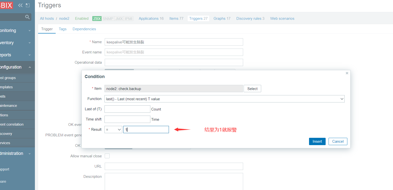 对脑裂的监控应在备用服务器上进行,通过添加zabbix自定义监控进行。