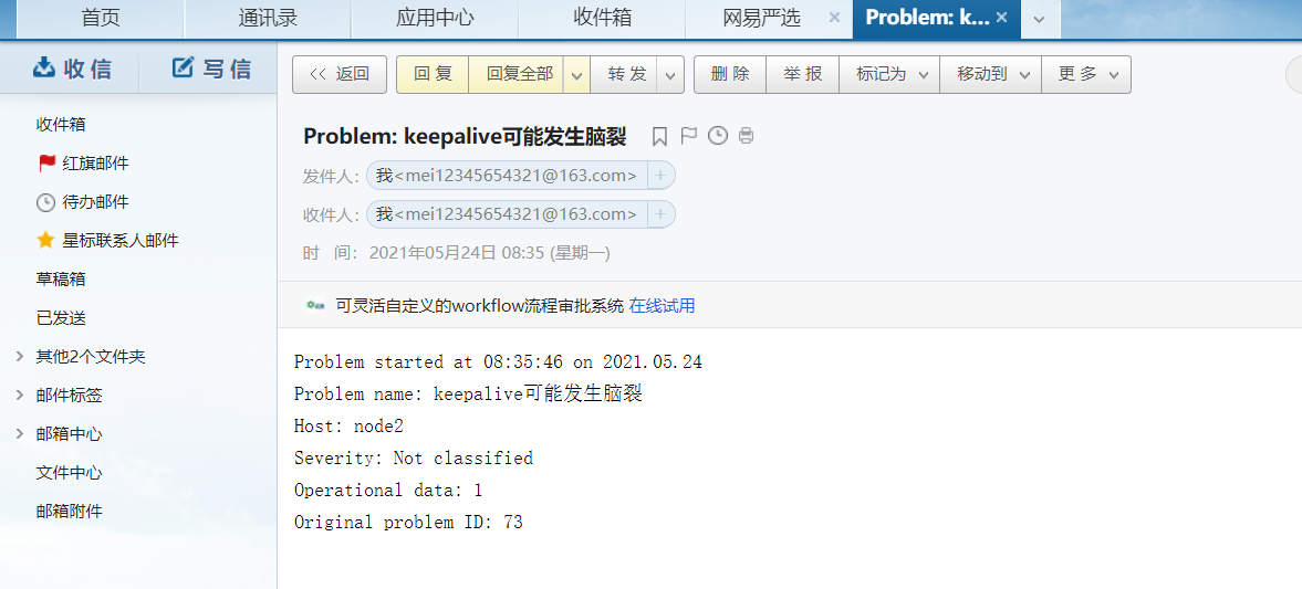 [root@slave ~]# mkdir /scripts [root@slave ~]# cd /scripts/ [root@slave scripts]# vim notify.sh #!/bin/bash VIP=$2 sendmail (){ subject="${VIP}'s server keepalived state is translate" content="`date +'%F %T'`: `hostname`'s state change to master" echo $content | mail -s "$subject" 1470044516@qq.com } case "$1" in master) nginx_status=$(ps -ef|grep -Ev "grep|$0"|grep '\bnginx\b'|wc -l) if [ $nginx_status -lt 1 ];then systemctl start nginx fi sendmail ;; backup) nginx_status=$(ps -ef|grep -Ev "grep|$0"|grep '\bnginx\b'|wc -l) if [ $nginx_status -gt 0 ];then systemctl stop nginx fi ;; *) echo "Usage:$0 master|backup VIP" ;; esac [root@slave scripts]# chmod +x notify.sh