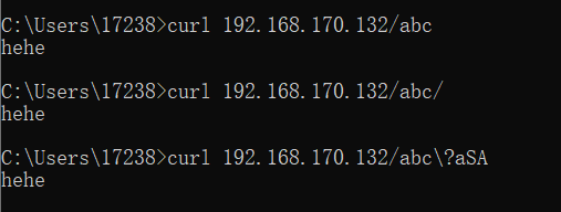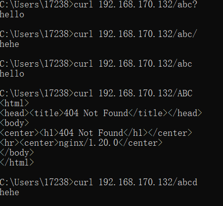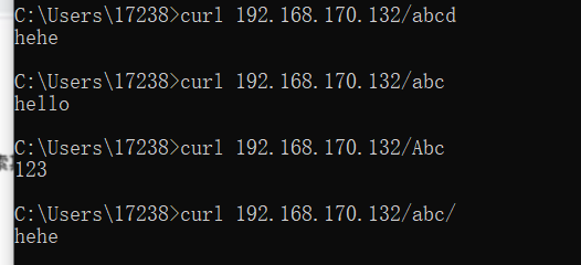 [root@localhost conf]# vim nginx.conf location / { root html; index index.html; } location /abc { echo "hehe"; } # location = /abc { # echo "nihao"; # } location ~ ^/abc$ { echo "hello"; } location ~* ^/abc$ { echo "123"; } [root@localhost conf]# nginx -t nginx: the configuration file /usr/local/nginx/conf/nginx.conf syntax is ok nginx: configuration file /usr/local/nginx/conf/nginx.conf test is successful [root@localhost conf]# nginx -s reload