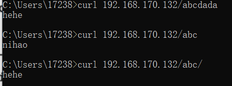 # location = /abc { echo "nihao"; } location ~ ^/abc$ { echo "hello"; } [root@localhost conf]# nginx -s reload