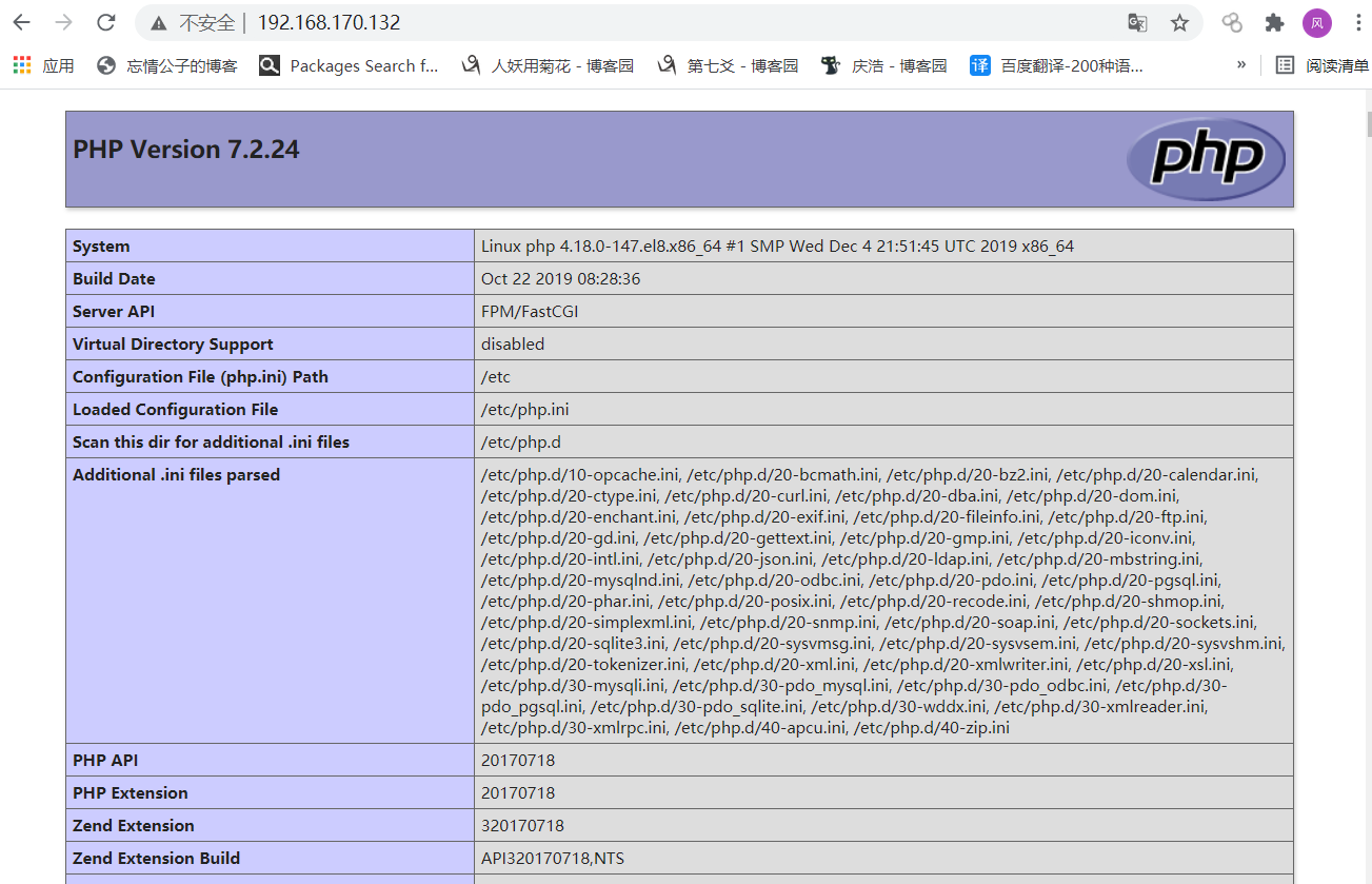 [root@php ~]# yum -y install libxml2 libxml2-devel openssl openssl-devel bzip2 bzip2-devel libcurl libcurl-devel libicu-devel libjpeg libjpeg-devel libpng libpng-devel openldap-devel pcre-devel freetype freetype-devel gmp gmp-devel readline readline-devel libxslt libxslt-devel php-mysqlnd //安装php [root@php ~]# yum -y install php-* //配置php [root@php ~]# vim /etc/php-fpm.d/www.conf ...................... ;listen = /run/php-fpm/www.sock #注释此行 listen = 0.0.0.0:9000 #添加监听端口 ........................... ........................... ; must be separated by a comma. If this value is left blank, connections will be ; accepted from any ip address. ; Default Value: any listen.allowed_clients = 192.168.248.132 #安装nginx主机的ip ................. //生成测试页面 [root@php ~]# vim /var/www/html/index.php <?php phpinfo(); ?> [root@php ~]# chown -R apache.apache /var/www/html/ [root@php ~]# systemctl restart php-fpm.service [root@php ~]# ss -antl State Recv-Q Send-Q Local Address:Port Peer Address:Port LISTEN 0 128 0.0.0.0:22 0.0.0.0:* LISTEN 0 128 0.0.0.0:9000 0.0.0.0:* LISTEN 0 128 [::]:22 [::]:*