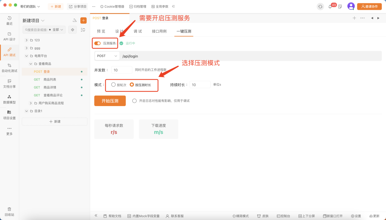 在接口列表中选择接口后,点击一键压测选项。配置并发数,选择压测模式根据压测模式输入持续时间或轮次,点击开始压测即可开始测试。注:使用压测功能需要开启压测服务。