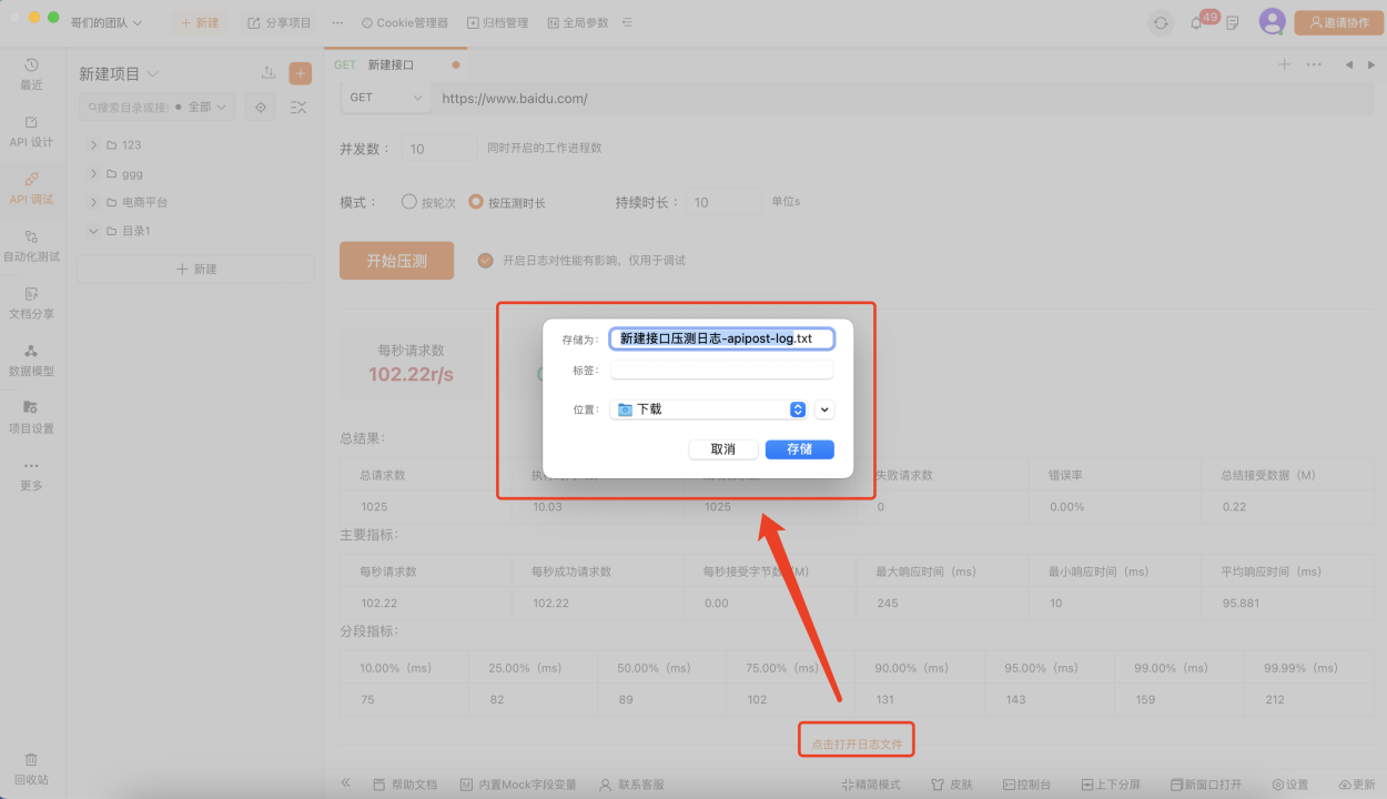 也可以开始压测日志选项,开启后压测结束会生成压测日志文件,压测日志会展示每轮测试情况