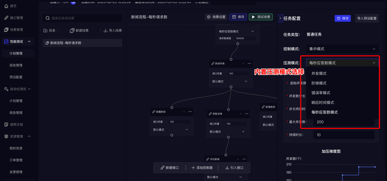 • 为了提升工作效率减少不必要的操作,RunnerGo自研可视化场景配置,压测模式选择,操作简单,配置直观。