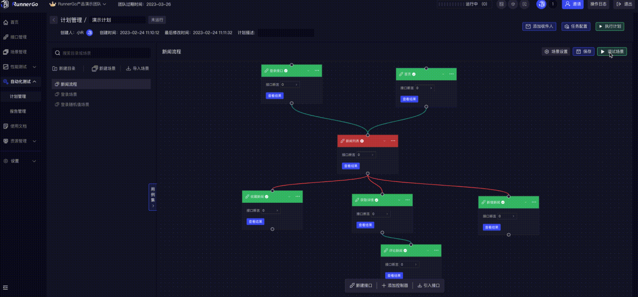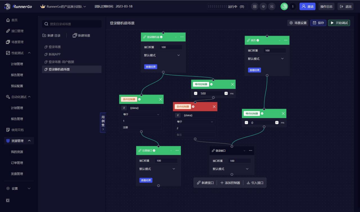 RunnerGo配置方法:点开场景管理-导入接口-直接在背景画布上连接接口即可配置好一条测试场景。在触发事件多的项目时可以添加条件控制器,等待控制器直接连接接口即可。