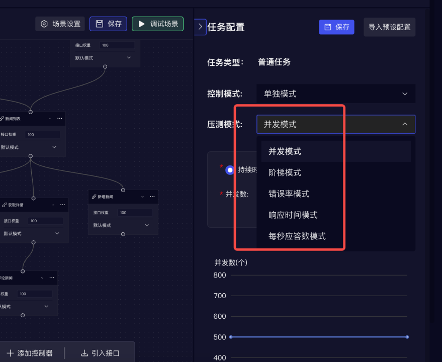 性能测试需要模拟实际生产中的各种情况。为了更好的还原真实业务场景,使用传统的压测工具需要先下载插件,而且配置起来非常繁琐,而在RunnerGo中,直接内置了并发模式、阶梯模式、错误率模式、响应时间模式、每秒应答数模式等多种常用压测模式,覆盖绝大多数压测场景,满足各种复杂业务的需要。满足更多的场景,RunnerGo内置多种压测模式一键即可修改。