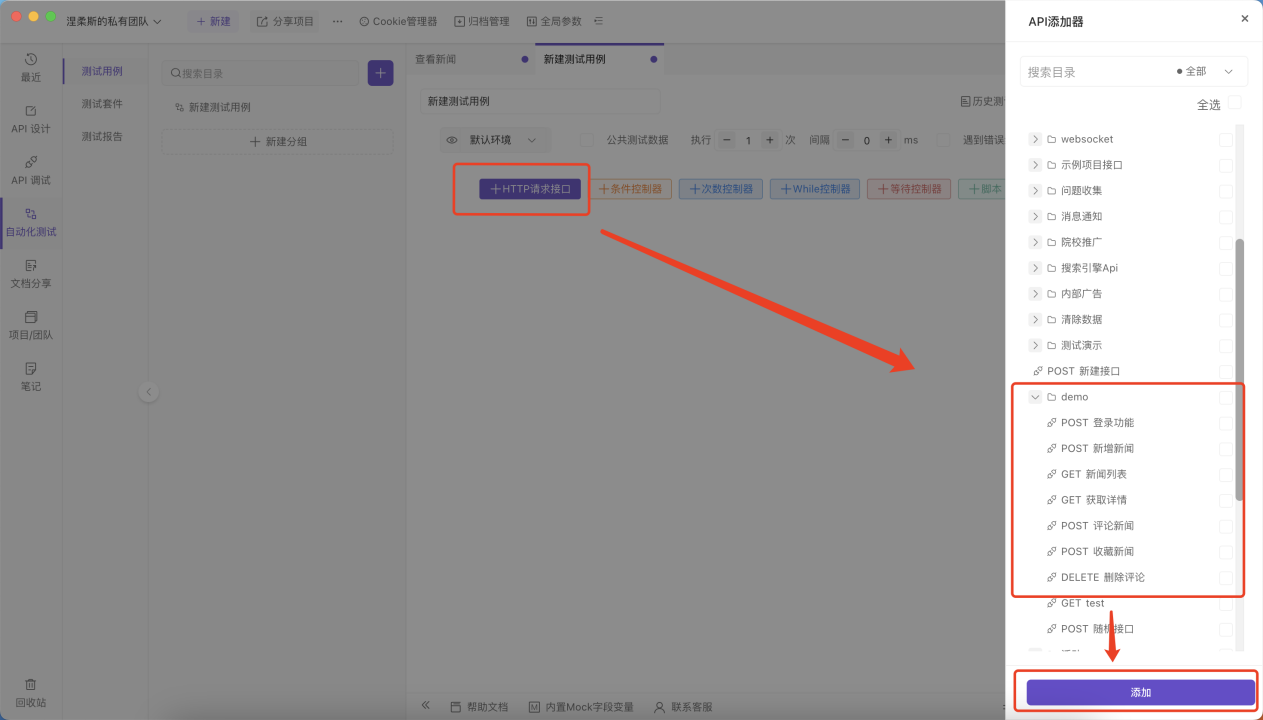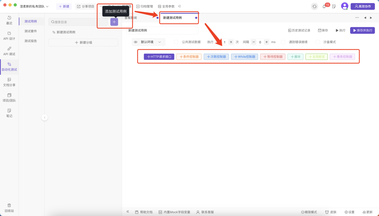 在左侧导航栏选择自动化测试进入自动化测试页面,点击加号添加测试用例,可以在测试用例中添加接口、断言、各种控制器。创建好的测试用例会存放在左侧列表中,方便后续直接进行修改和使用。