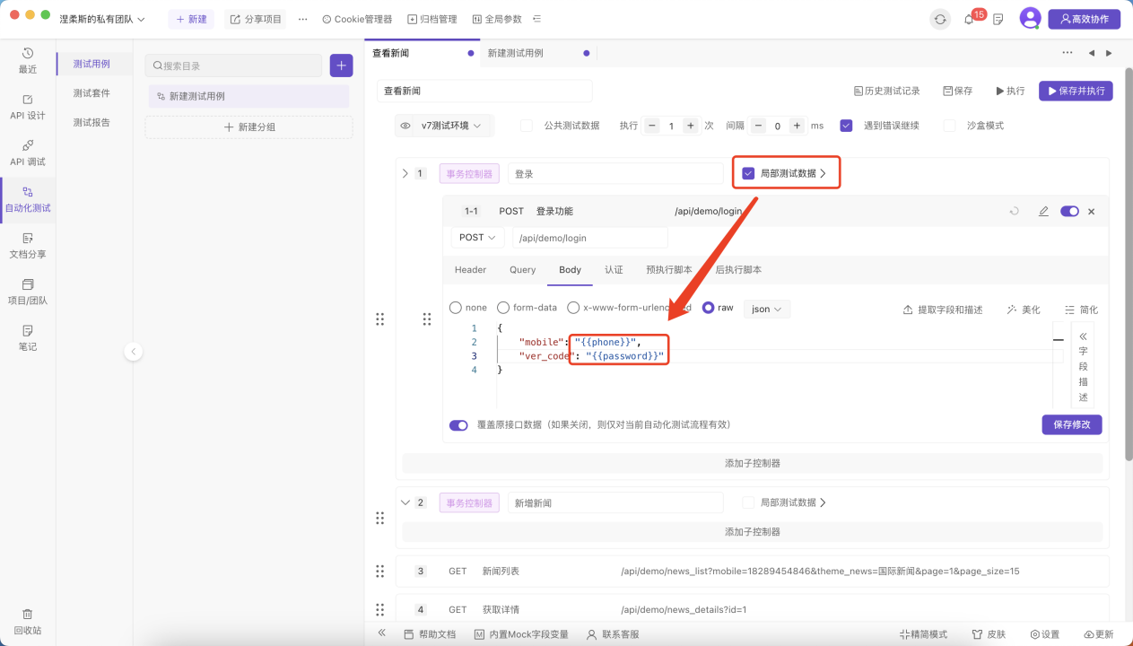Apipost是一款Api管理工具,我们在配置自动化测试用例时直接从Api管理中导入已经调试完成的接口。这里用一个登录查看新闻场景为例。