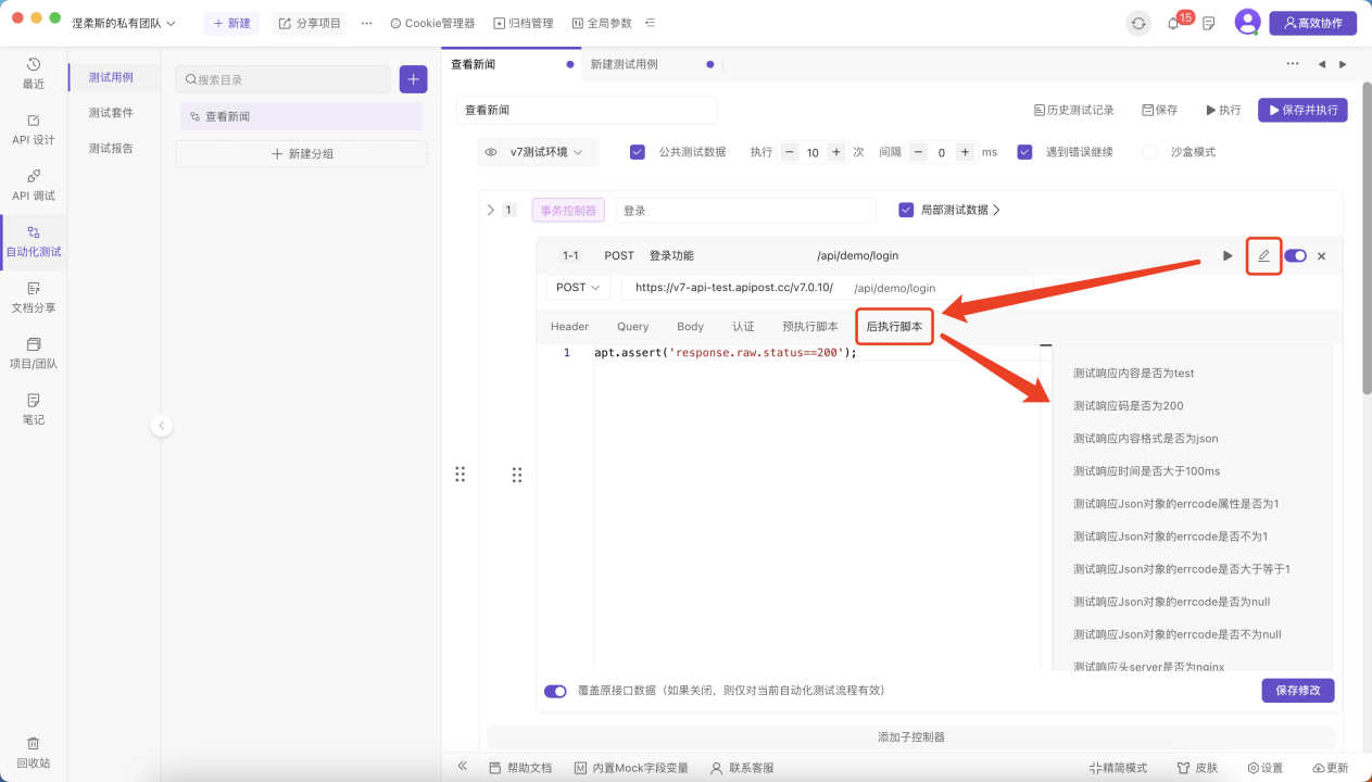 可以在单个接口中的后执行脚本添加接口断言。这里登录接口我们一般判断响应码,可以直接在右侧添加。