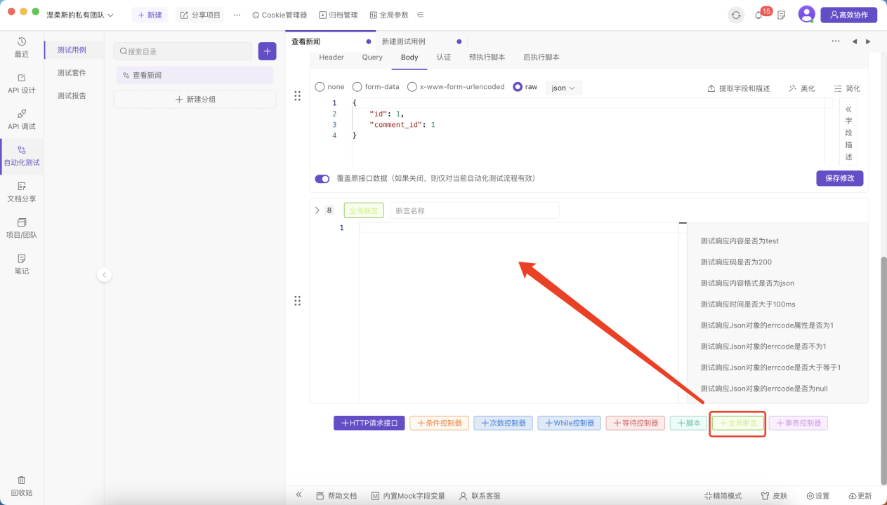 也可以添加全局断言,会判断每个接口的返回结果。