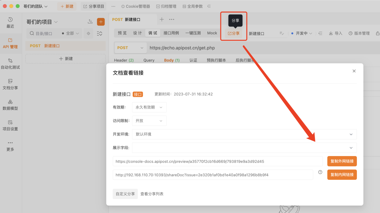 Apipost提供API文档管理功能,让后端开发人员可以在开发完接口调试的工程中直接生成接口文档,大大减少了手动撰写接口文档的工作量。在API调试页面点击分享文档即可生成接口文档,可以复制链接分享。