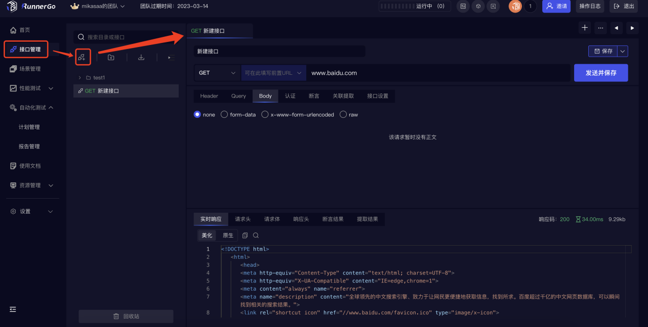 我们先模拟一个http请求,点击接口管理-新建接口,随便输入一个url,点击发送并保存。可以看到响应区会展示响应体、响应码、响应时间等内容。请求区可以设置请求头、断言、关联提取。同时也支持多种请求方式。