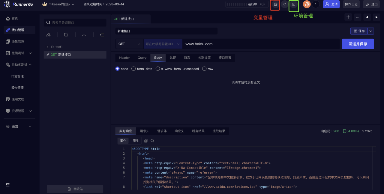 我们在进行接口测试前需要配置环境和全局变量。可以点击右上角环境管理、变量管理来配置环境和变量。