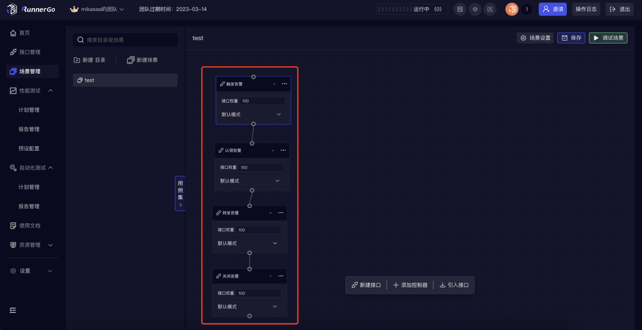 为什么说对RunnerGo的场景管理印象比较深呢,接口导入后如上图是一个个的接口方块,如下图:连接接口方块来组成一条测试场景,点击右上角调试场景即可查看场景是否调通。相比较其他工具列表或堆叠,这个操作起来更简单且更直观。