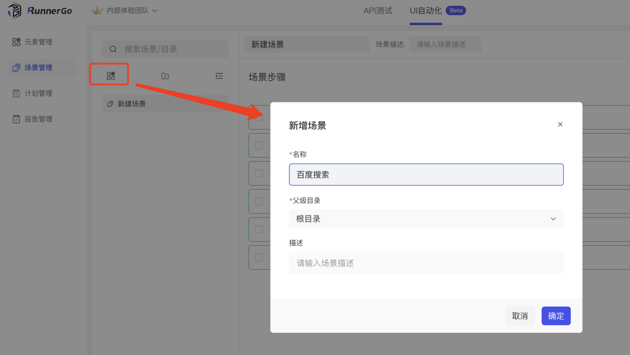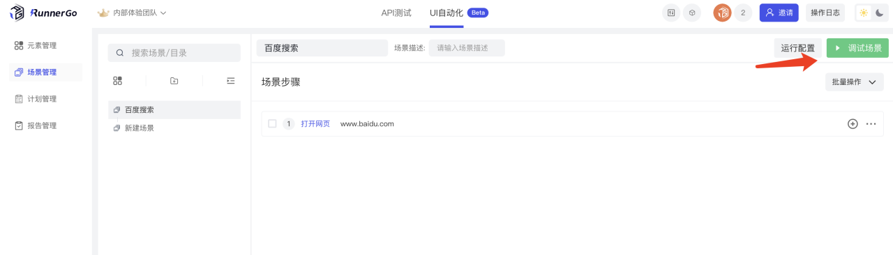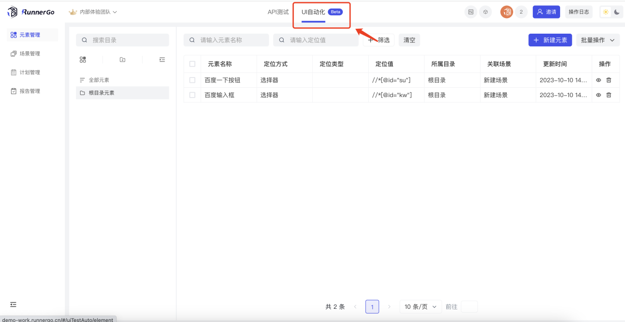 点击体验企业版进入工作台后可以点击页面上方的UI自动化 进入到测试页面