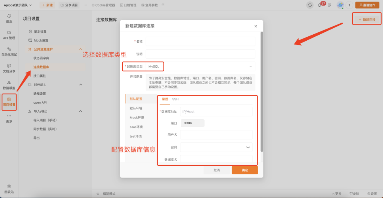 在「项目设置」-「公共资源维护」-「连接数据库」中配置需要连接的数据库信息
