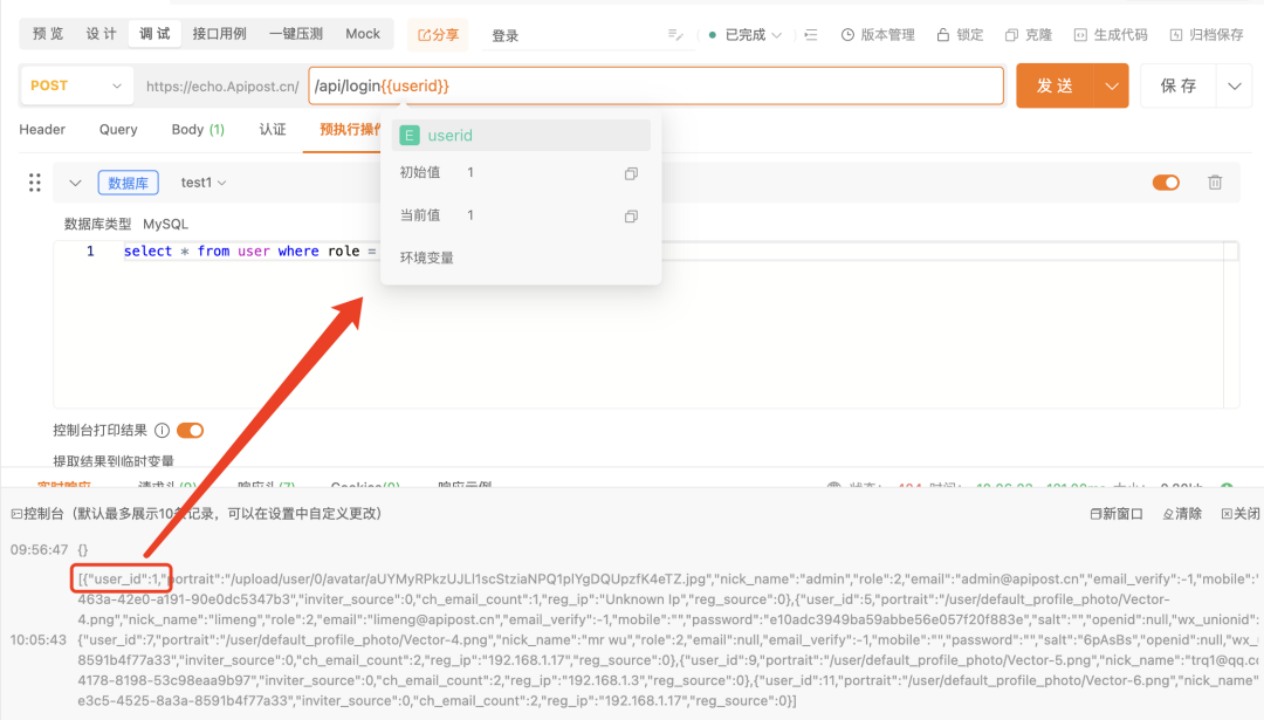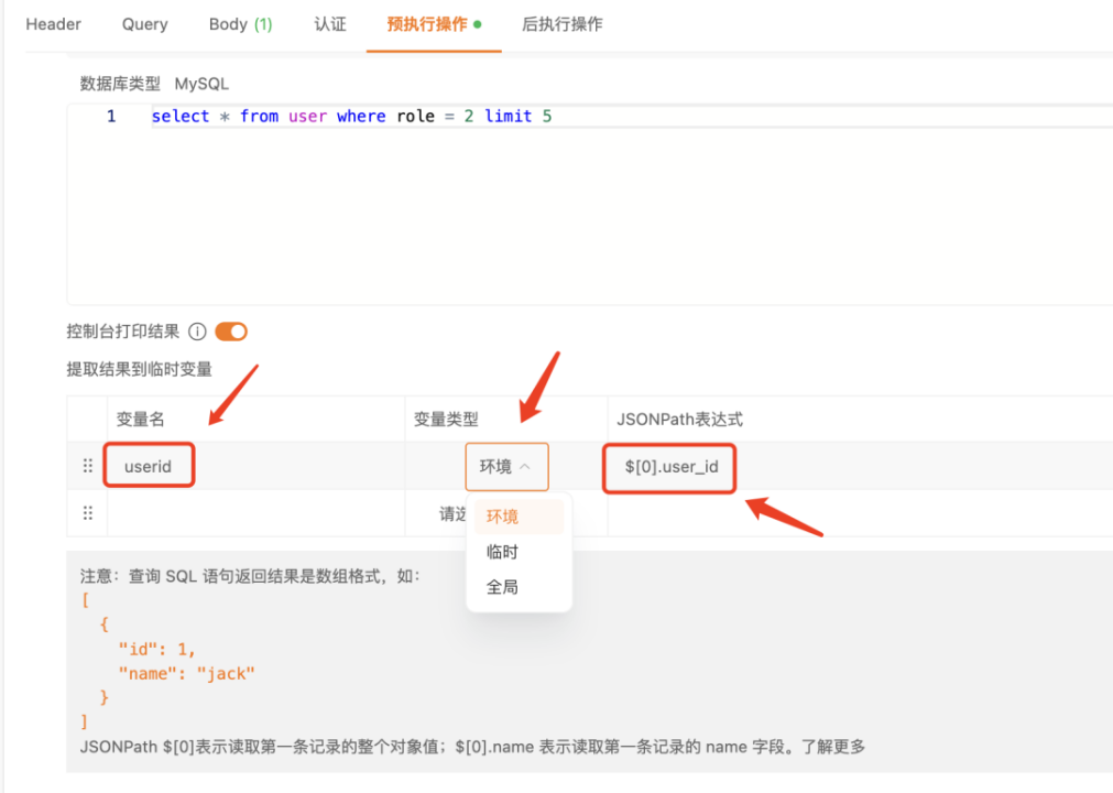 开启控制台打印结果后可以在控制台查看sql语句的执行结果,可以根据控制台返回结果来使用JSONpath表达式获取变量值。