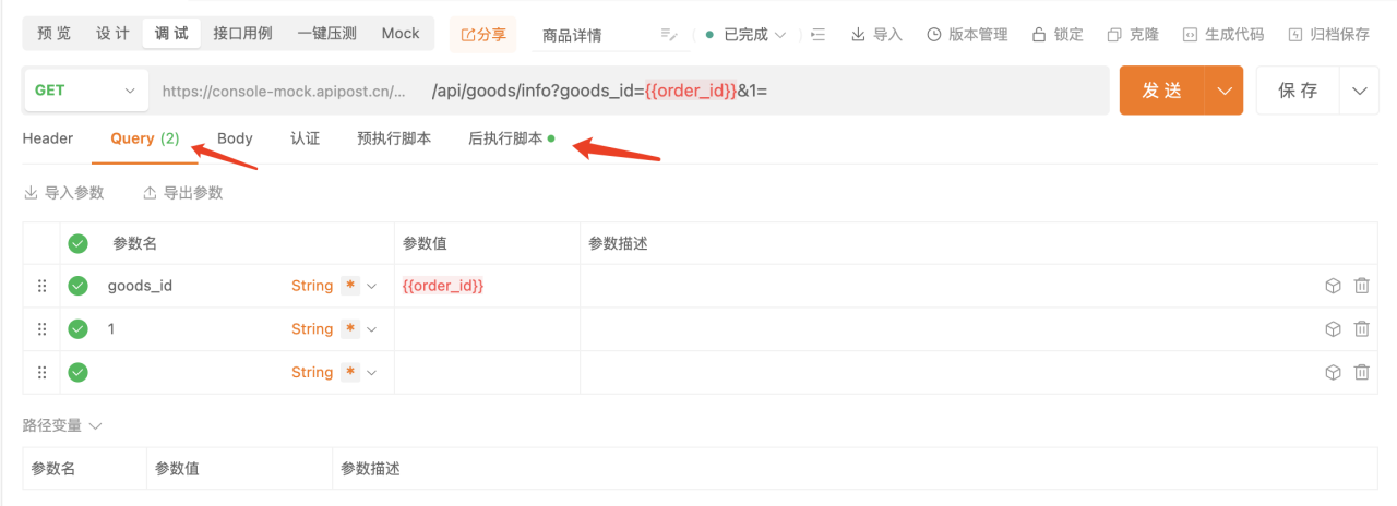 在请求区填入请求参数或脚本时会有相应的标识
