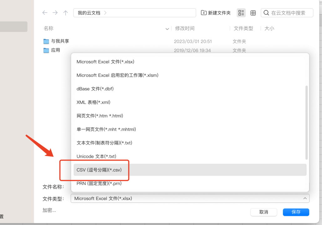 保存文件时将文件类型修改为CSV