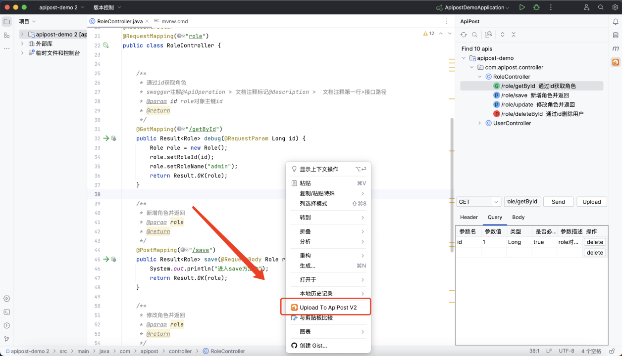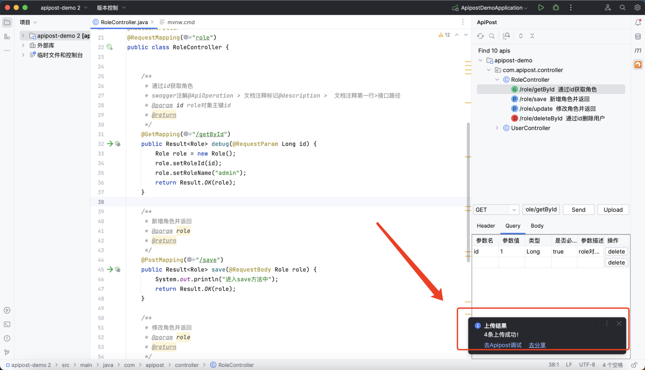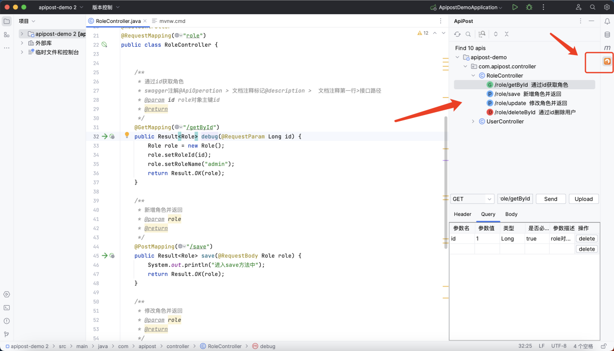 安装后右侧会有一个Apipost图标,可自动识别项目中的 controller选中接口即可发送请求: