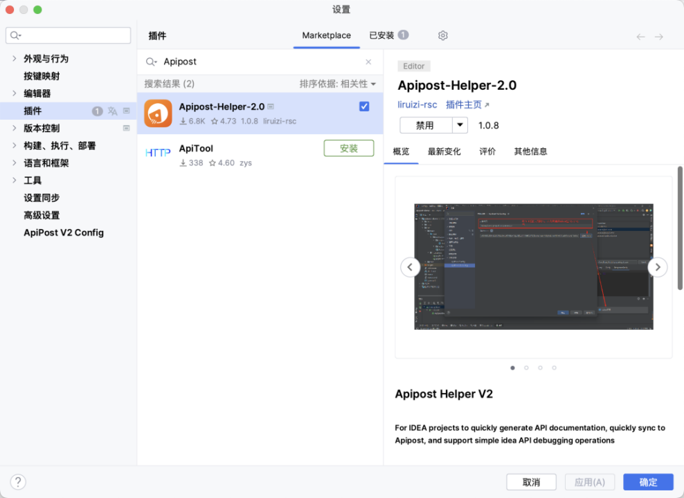 在IDEA编辑器插件中心输入Apipost 搜索安装: Apipost-Helper-2.0