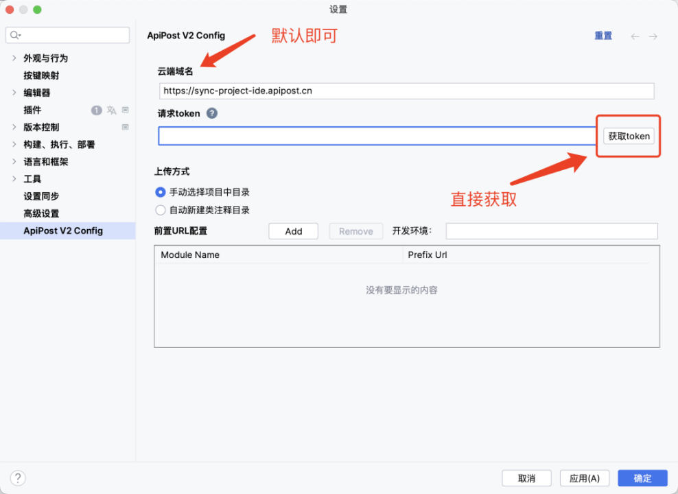 云端域名默认为:https://sync-project-ide.apipost.cn 无需修改请求token可以在Apipost 「项目设置」- 「对外能力」-「openAPI」中创建使用,也支持在IDEA中直接获取请求token。
