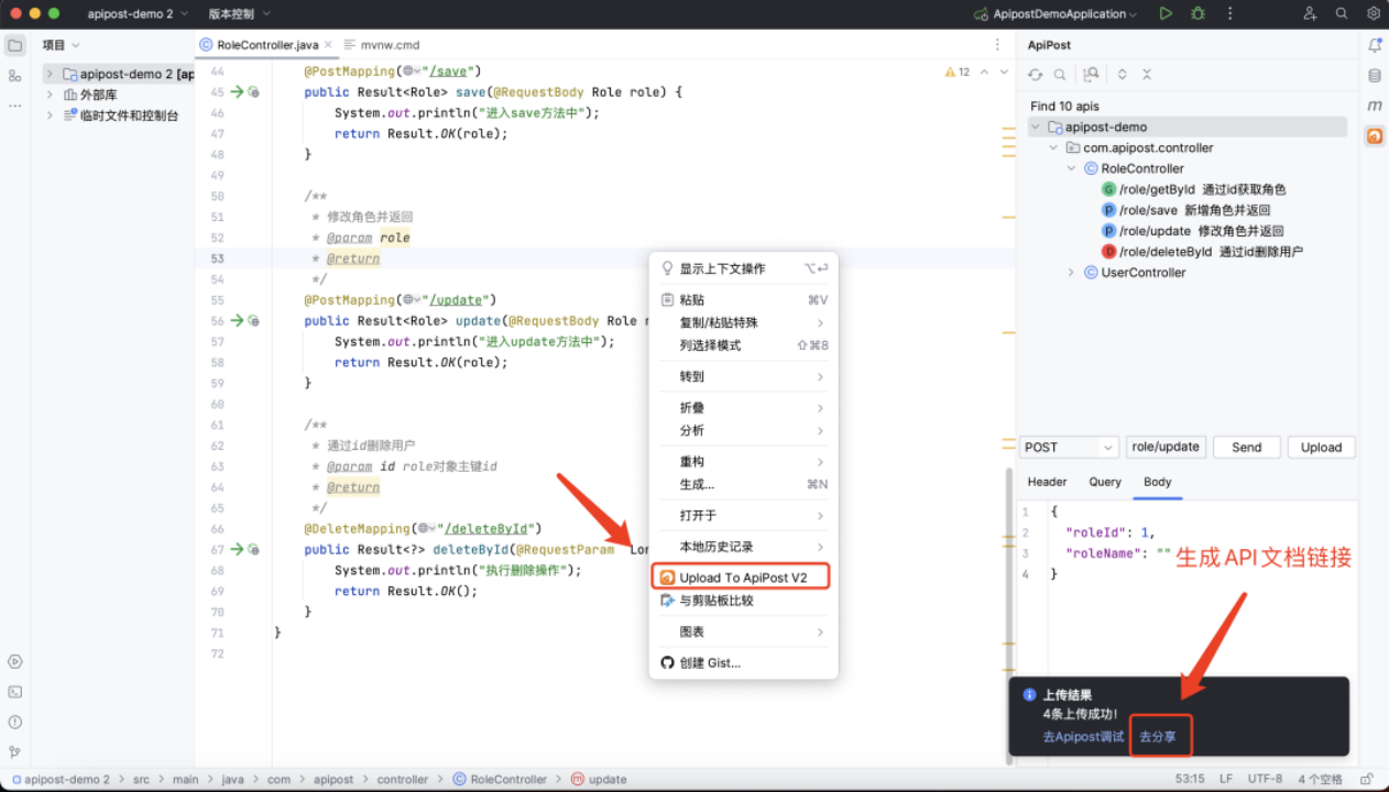 编写完代码后,右键点击 「Upload to Apipost」即可快速将源码中包含的API以及注解同步至Apipost中,并生成可以访问的API文档链接。