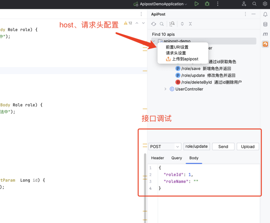 代码编写完成后,可以点击右侧Apipost图标进行快速调试,调试功能新增header、host配置
