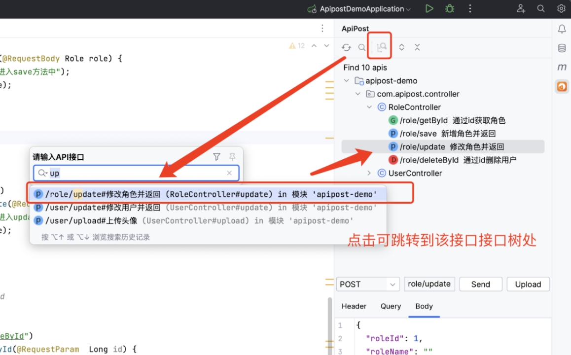 接口代码处展示箭头图标,点击即可快速跳转至对应接口列表处
