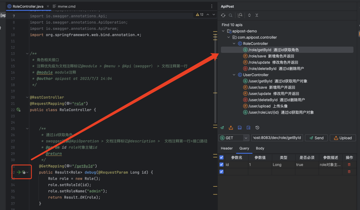 代码编写完成后,可以点击右侧Apipost图标进行快速调试,调试功能可以进行header、host配置