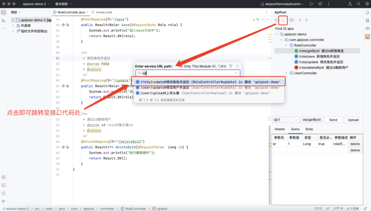 编写完代码后,右键点击 「Upload to Apipost」即可快速将源码中包含的API以及注解同步至Apipost中,并生成可以访问的API文档链接。