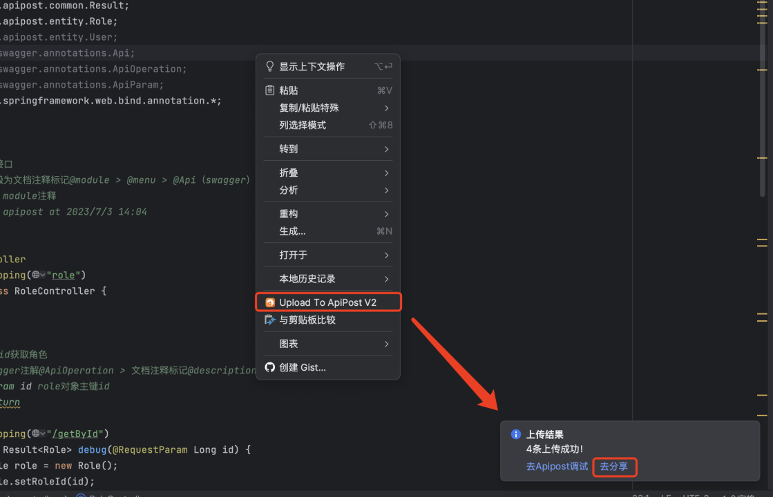 编写完代码后,只需右键upload同步接口即可快速将源码中包含的API以及注解自动生成API文档,并生成可以访问的链接。无需任何额外操作。