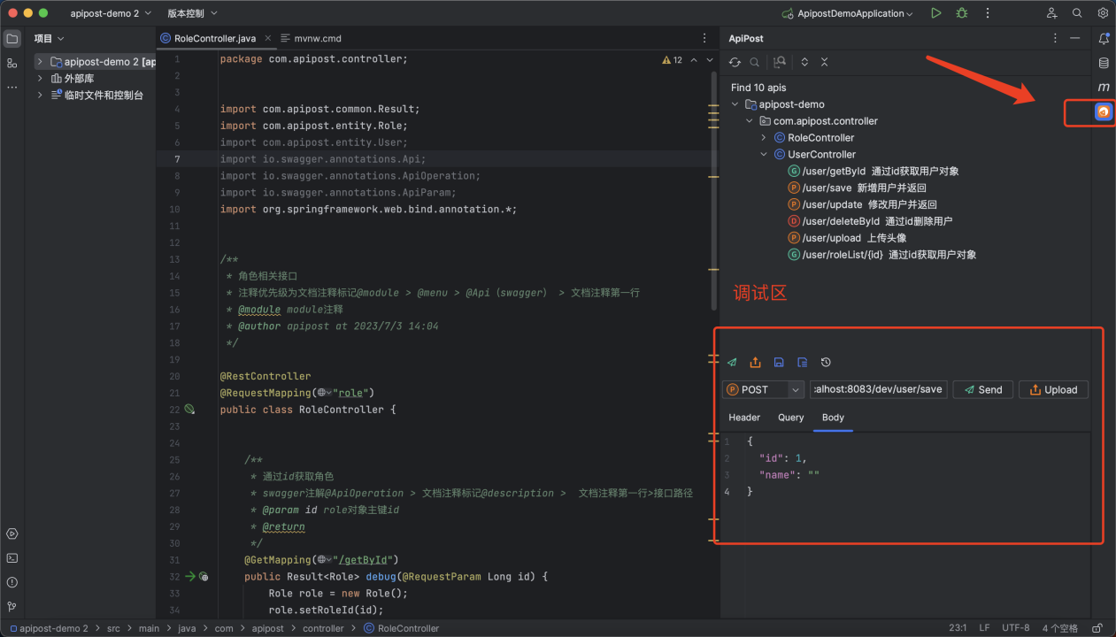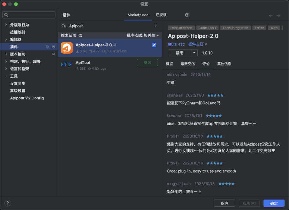 这款插件由Apipost团队开发的,其官方介绍是:用于IDEA项目快速生成API文档,快速查询接口、接口代码功能,并支持在IDEA中进行API调试操作。在IDEA编辑器插件中心输入Apipost 搜索安装: Apipost-Helper-2.0