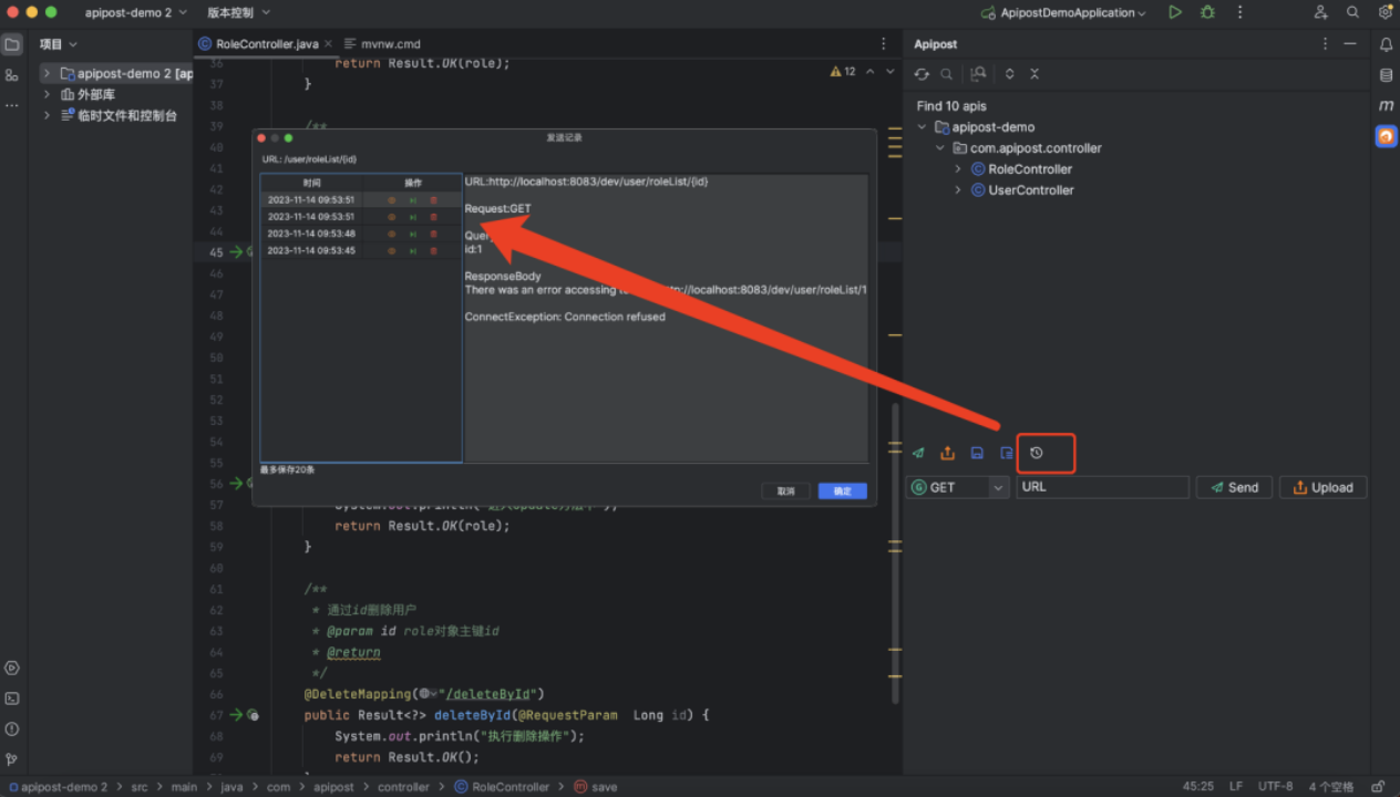 点击左下角发送界面按钮,可查看接口的发送记录和发送详情