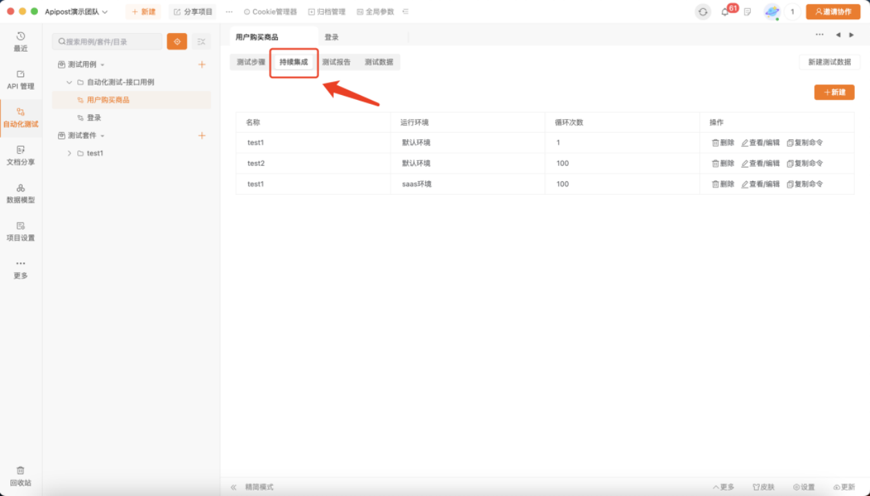 在创建好的测试用例中选择「持续集成」