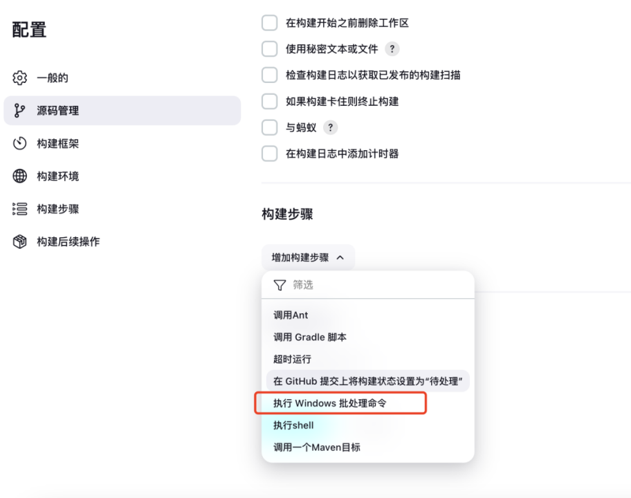 然后在构建栏目下拉菜单选择:Excute Windows batch command