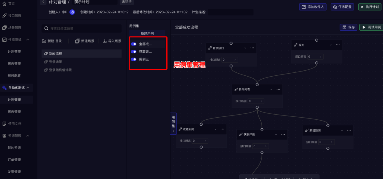 RunnerGo自研可视化场景配置,在配置时用户可以在场景画布上连接API,创建等待控制器、条件控制器来组建一条完整的场景流测试,支持添加前置条件,可以从数据库中获取真实的用户数据。