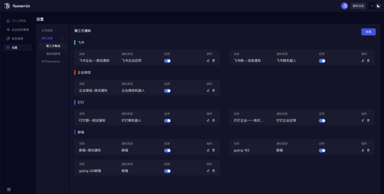为了更好的进行多团队多项目管理,RunnerGo推出企业管理后台,管理后台分为四个模块有:个人工作台、企业成员管理、角色管理、设置(第三方消息通知)。