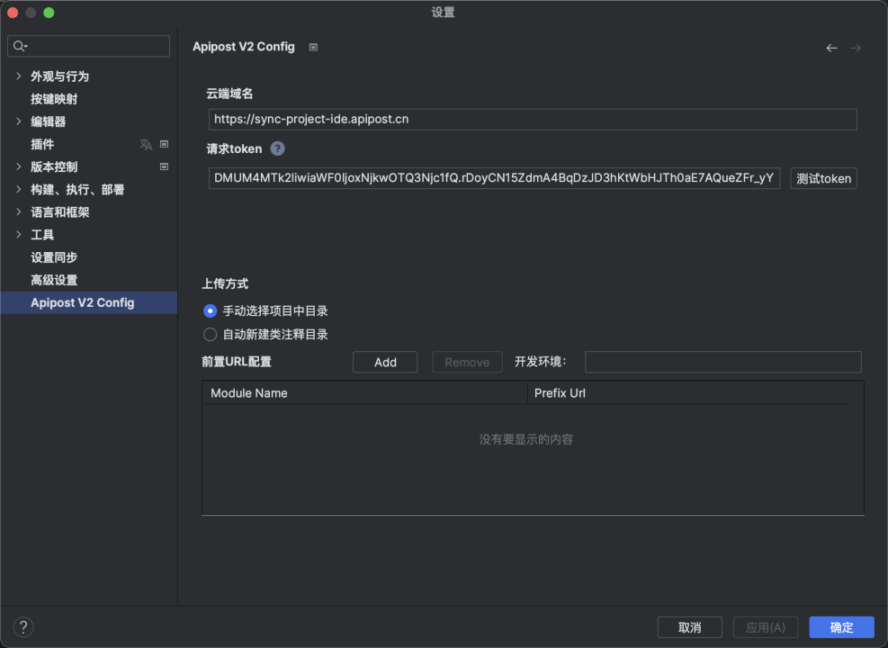 云端域名默认为:https://sync-project-ide.apipost.cn 无需修改请求token可以在Apipost 「项目设置」- 「对外能力」-「openAPI」中创建使用,也支持在IDEA中直接获取请求token。