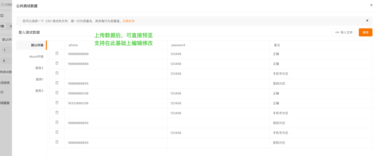新建测试数据,选择要进行测试的环境 上传准备好的csv文件,注意一定要是UTF-8格式