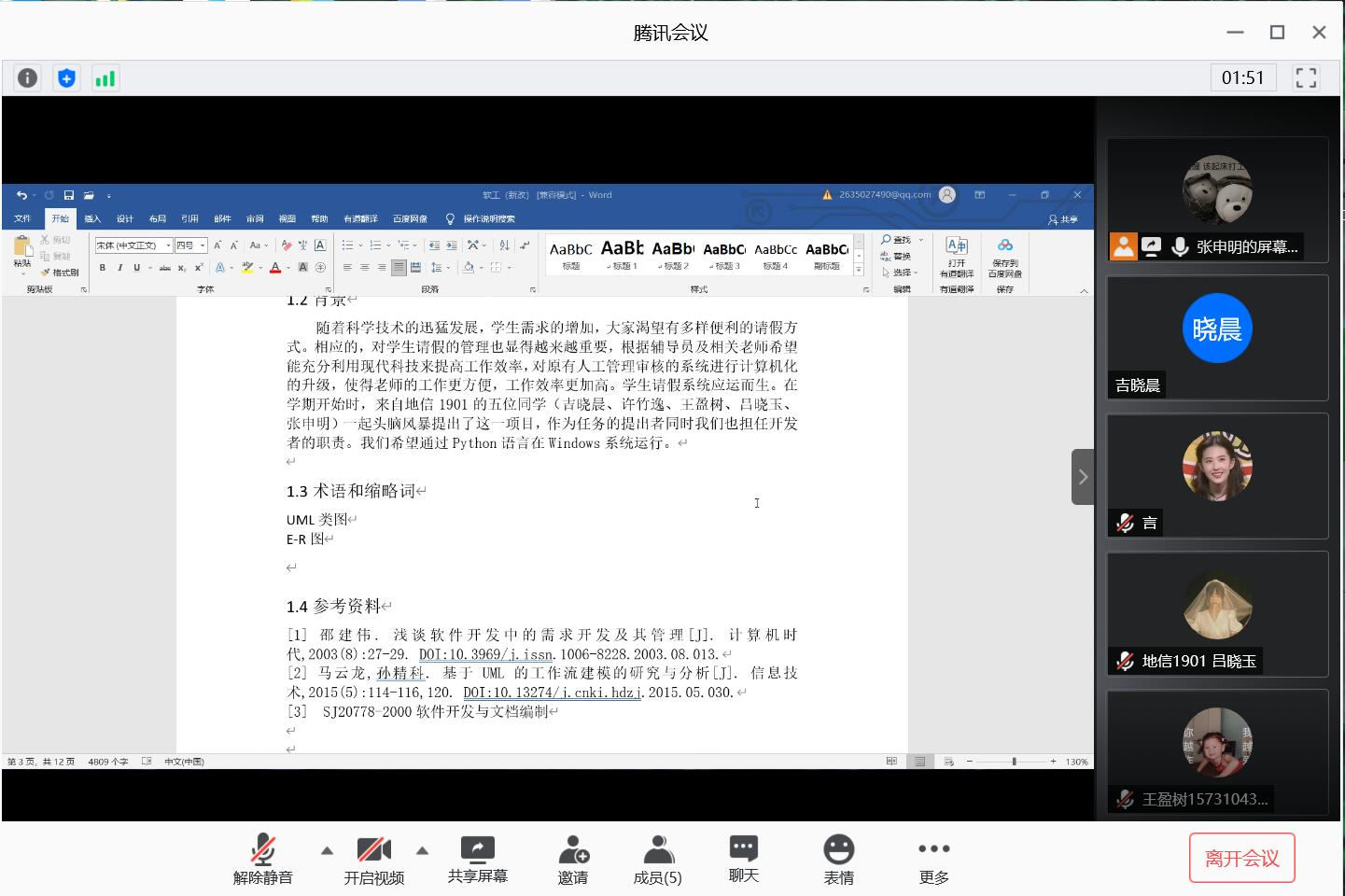本次我们小组进行的是需求分析的讨论会,会上对我们组所要做的程序所要解决的需求进行了梳理,包括功能需求、数据需求、用户需求、运行需求等主要方面。我们讨论并确认了请假系统主要包括四个方面的功能,对每个功能实现时的流程进行了设想和讨论,对学生端和教师端的,功能进行了分类和描述。在数据需求方面,确定了静态数据、动态数据、数据字典、数据库相关描述的内容,对于系统的需求、系统设计也进行了讨论,最后我们讨论了一下运行需求的内容,对于用户界面、软件接口、硬件接口等内容也进行了讨论。在对所有需要讨论的内容整理之后,我们对每个人所要进行的书面工作进行了分工,在最后进行整合成需求分析书。