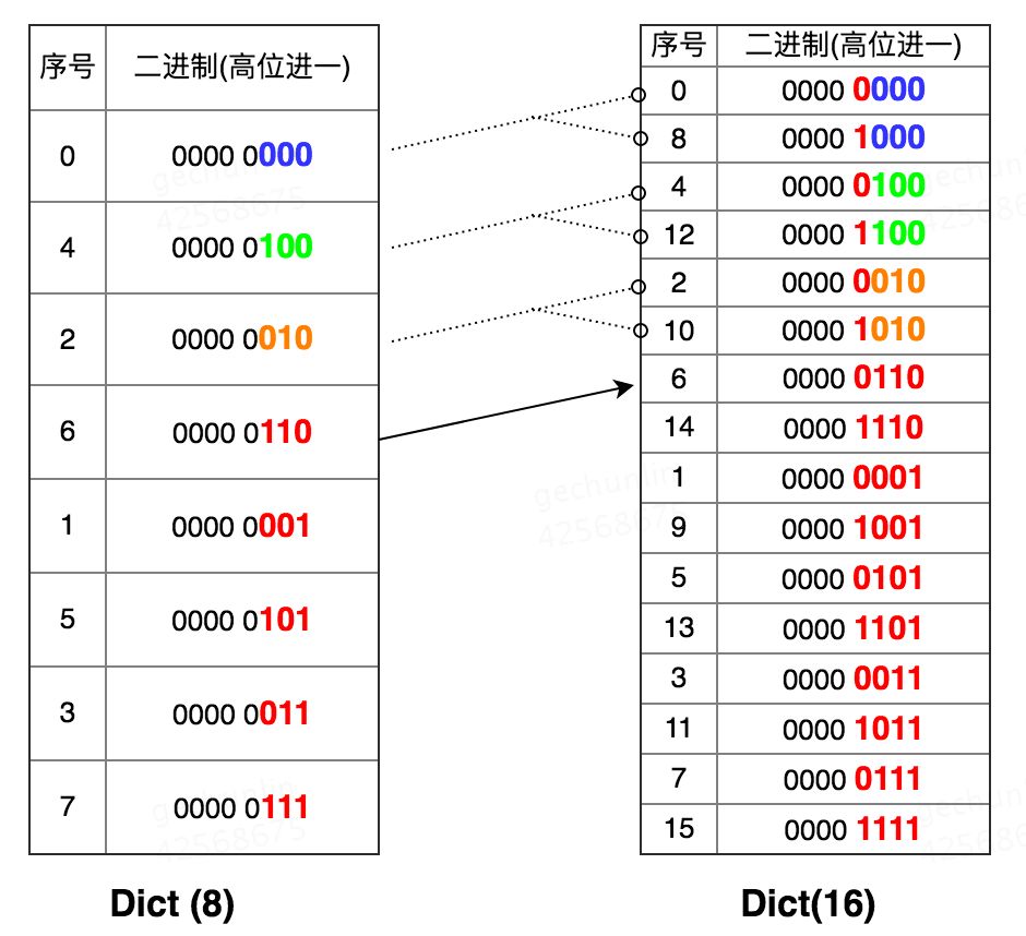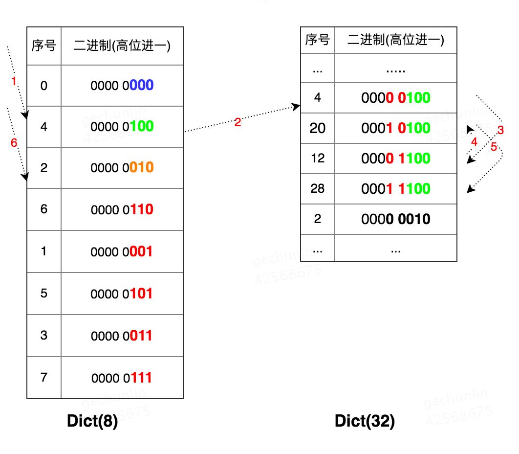 这种状态,即Dict是静止的。针对这种状态下的上述三种场景,Redis采用上述的Reverse Binary Iteration(反向二进制迭代算法):