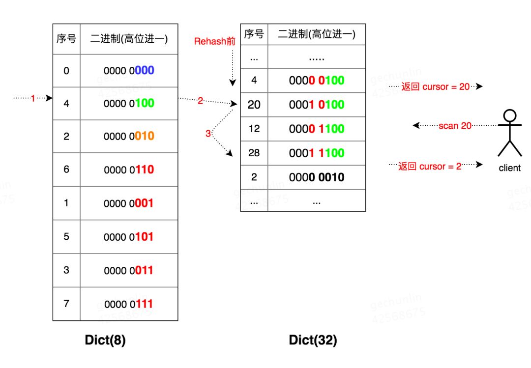 如果在Rehash开始前返回的Cursor是在小表能表示的范围内(即不超过7),那么在进行高位有效位的加一操作时,必然都是从0开始计算,每次加一也必然能够访问的全所有的相关桶;如果在Rehash开始前返回的cursor不在小表能表示的范围内(比如20),那么在进行高位有效位加一操作的时候,就有可能跳过 ,或者重复访问某些桶的情况。
