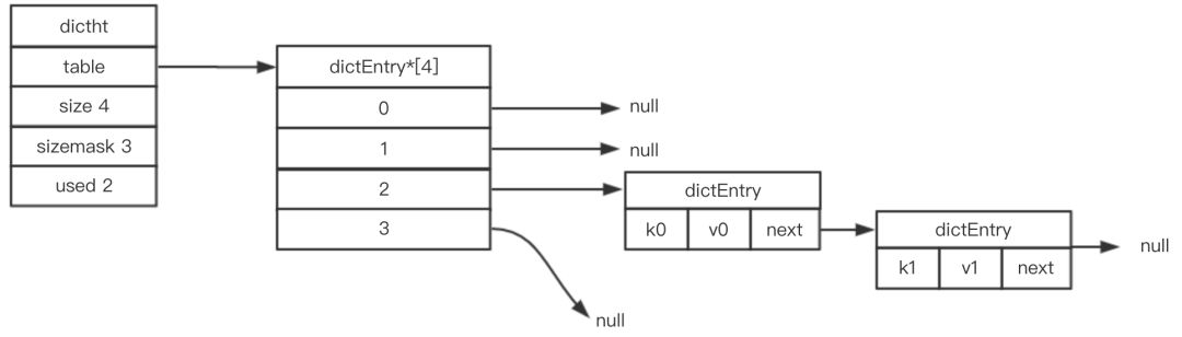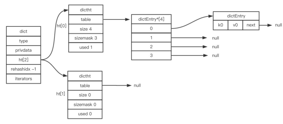 一个Dict对应2个Dictht,正常情况只用到ht[0];ht[1] 在Rehash时使用。