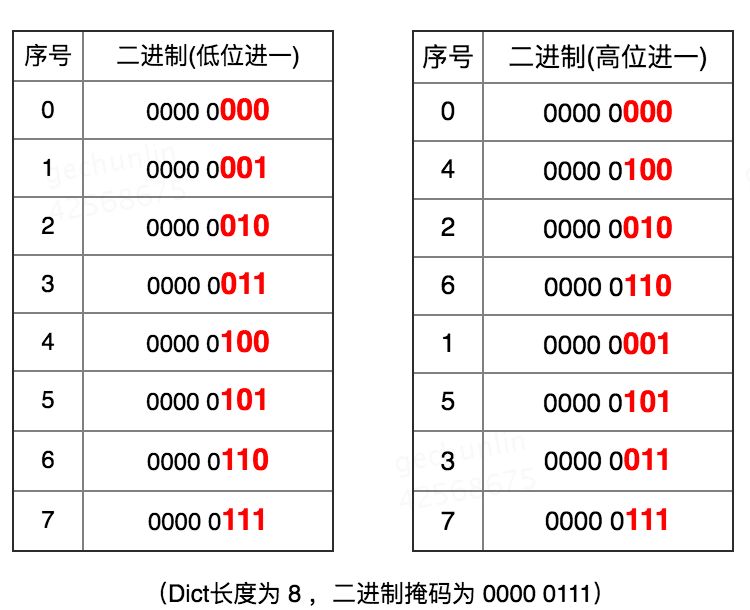 这里可以看到大表的相关桶的顺序并非是按照之前所述的二进制高位序,实际上是按照低位序来遍历大表中高出小表的有效位。